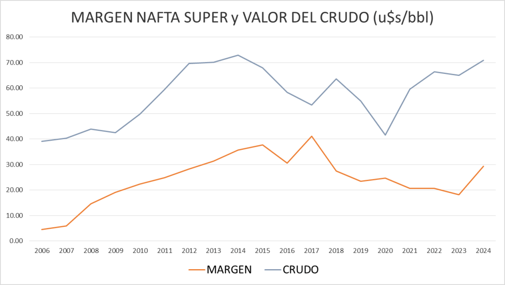 | Año | Valor producto (u$s/litro) | Margen (u$s/bbl) | Crudo promedio (u$s/bbl) |