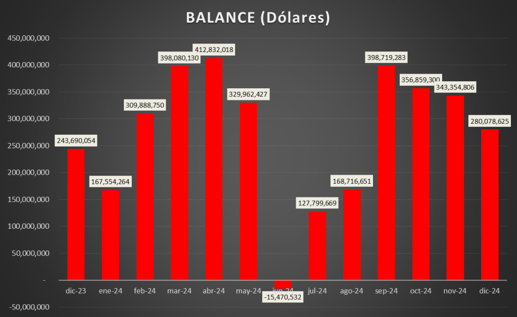 Las importaciones totales en diciembre de 2024 fueron de 105,9 MMu$s y las exportaciones de 386,0 MMu$s, resultando un balance positivo de 208,1 MMu$s.
