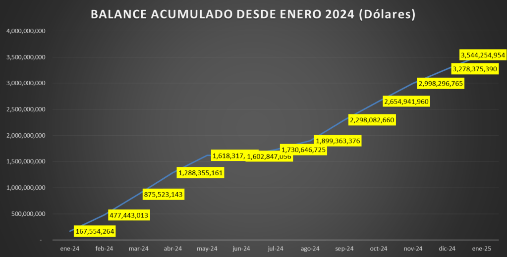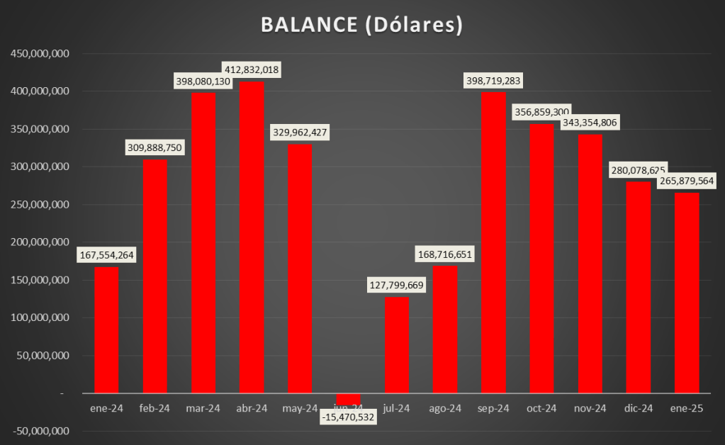 Las importaciones totales en enero de 2025 fueron de 136 MMu$s y las exportaciones de 401,9 MMu$s, resultando un balance positivo de 265,9 MMu$s.