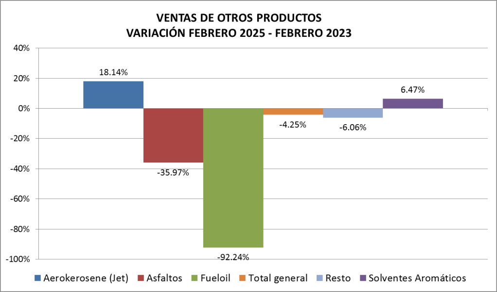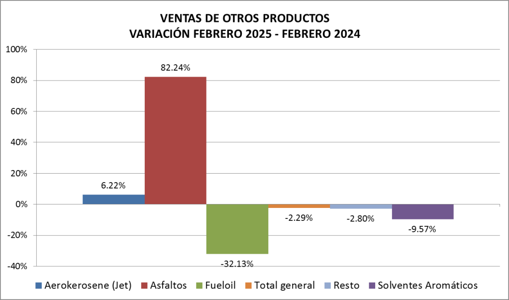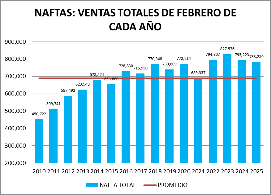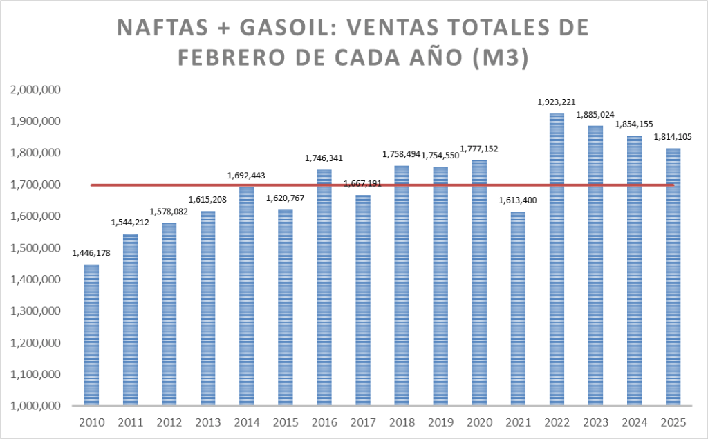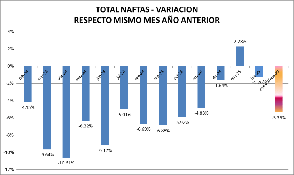 En febrero de 2025 las ventas totales de naftas bajaron un 9,27 % respecto al mes anterior, y fueron un 1,26% también menor que un año atrás.