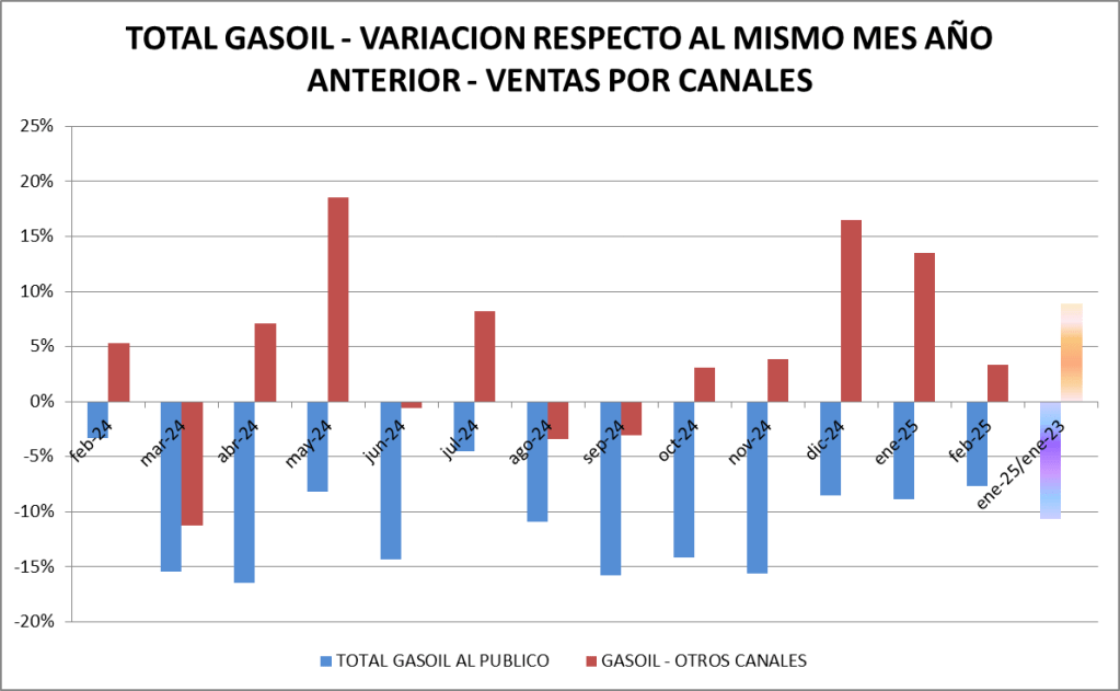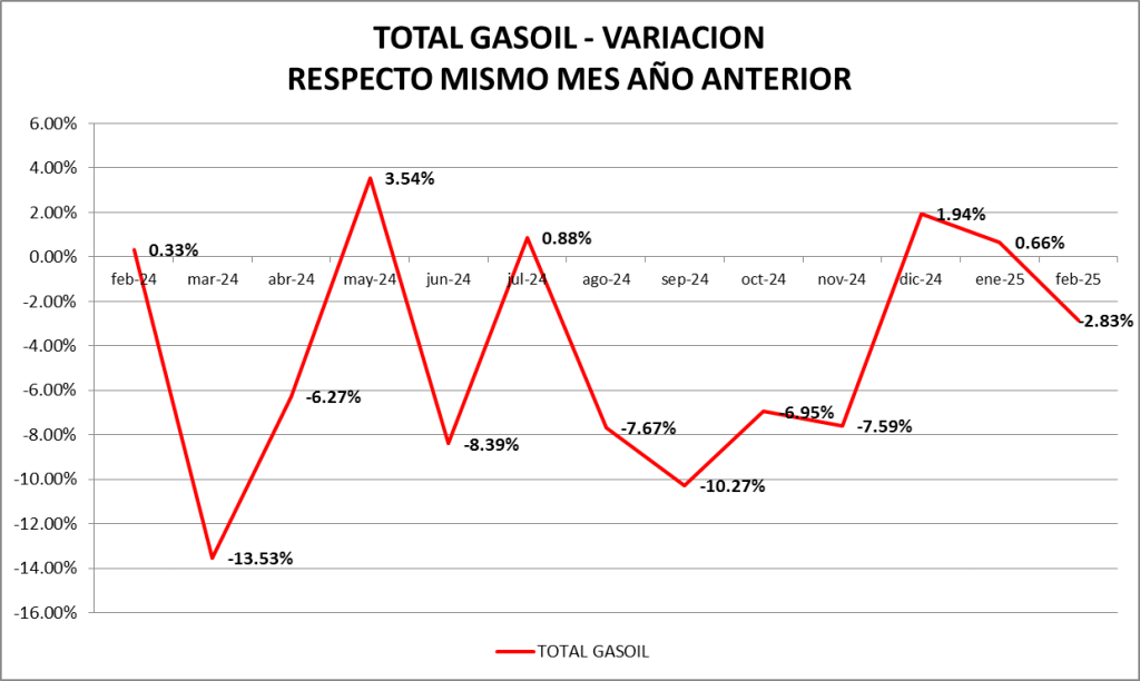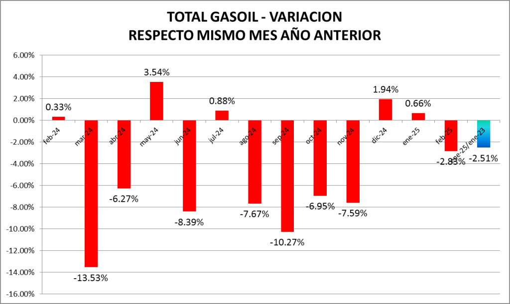 En este caso, las ventas de gasoil total fueron, en febrero de 2025, un 2,51% inferior a las de febrero de 2023.