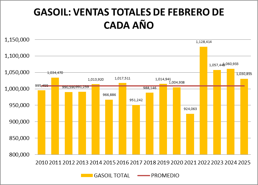 Con respecto a enero de 2025, las ventas totales de gasoil fueron un 9,00% menor. Sin embargo hacemos notar que la diferencia de cantidad de días en ambos meses opera fuertemente. Haciendo el cálculo con los valores diarios, la venta de gasoil total subió un 0,75%.