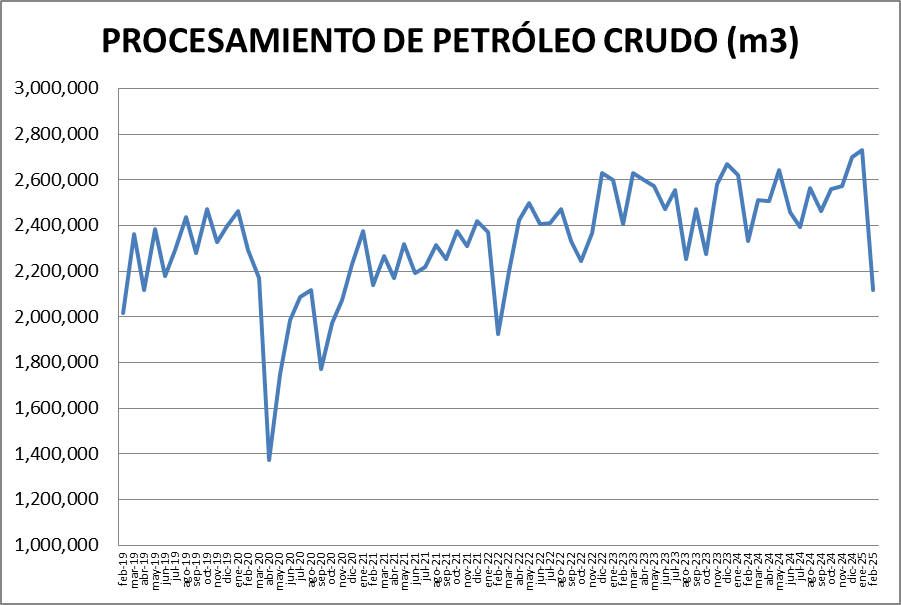 En febrero de 2025, el procesamiento de petróleo crudo bajó un 22,5% respecto del mes anterior. Respecto a febrero de 2024, se procesó un 9,2% menos.