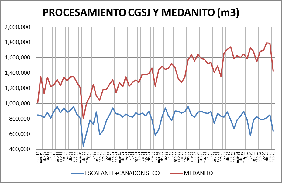 Escalante-Cañadón Seco: Se procesó, en febrero de 2025, un 24,9% menos que en enero de 2025 y un 4,97% también menos que en febrero de 2024.