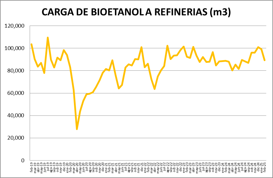 En cuanto al bioetanol, se utilizó en febrero de 2025, un 9,7% menos que en enero de 2025.
