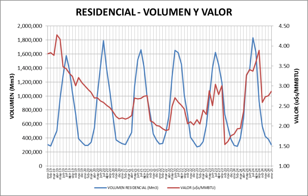 El sector Residencial es el que consume más cantidad de gas natural, en invierno, con una muy clara estacionalidad.