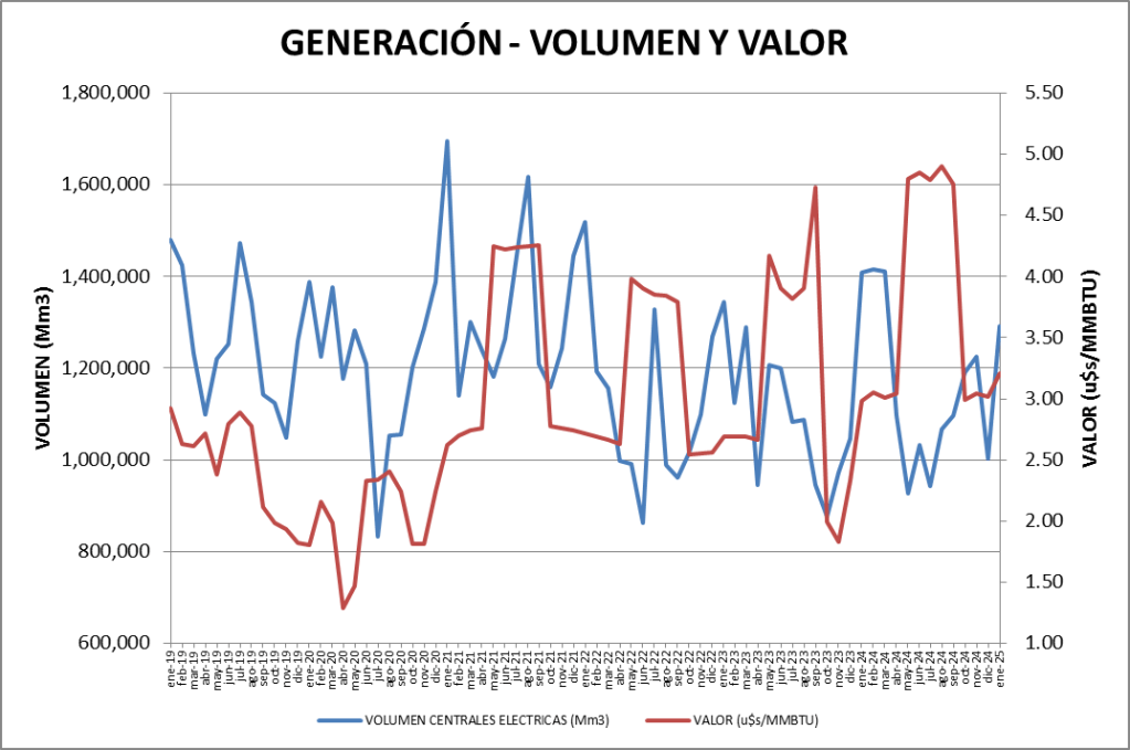 En cuanto al volumen, se consumieron 41,6 MMm3/día en promedio 28,8% más que el mes anterior y 8,4% inferior a enero de 2024.