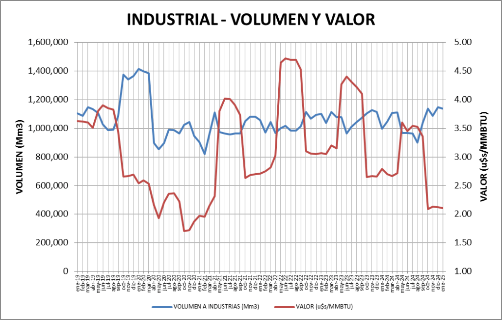 El valor del gas natural con dirección al sector industrial bajó un 0,47% en enero de 2025 respecto a diciembre de 2024.