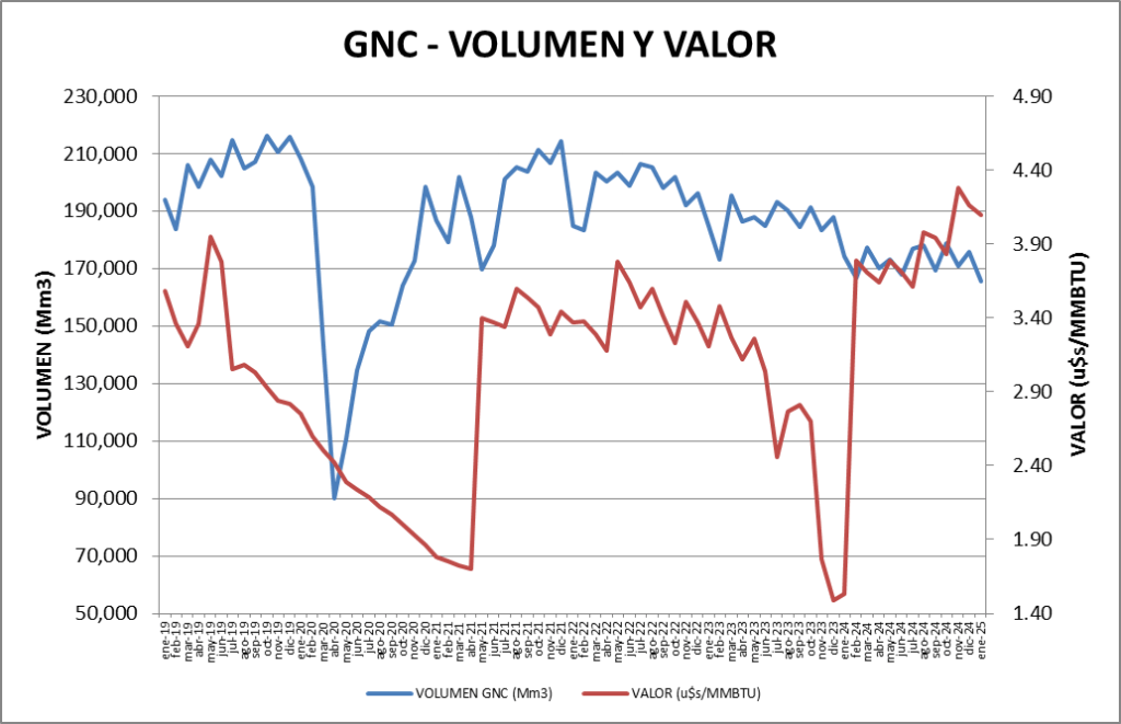 Se vendieron, en enero de 2025, 5,35 MMm3/día de Gas Natural Comprimido, valor un 5,7% por debajo del mes anterior y un 4,9% también menor al de enero de 2024.