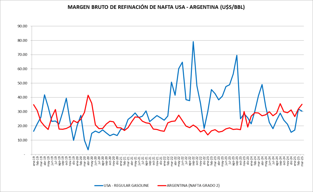 El margen bruto de la nafta supera, en marzo de 2025, todos los promedios adoptados como referencia.