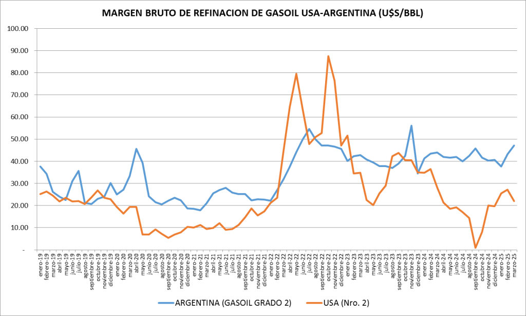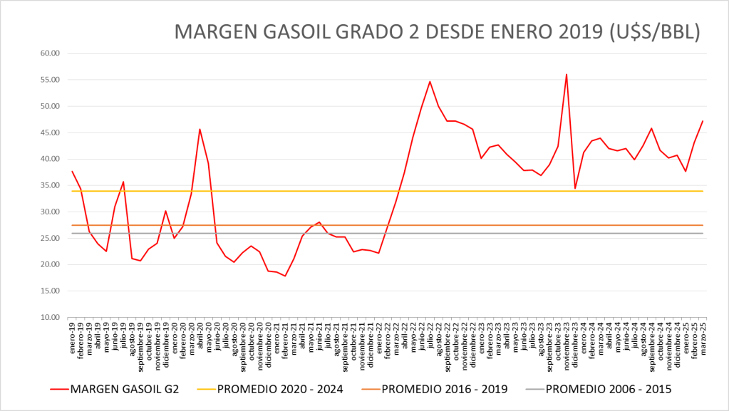 El Margen del gasoil grado 2 de marzo de 2025 (47,17 u$s/bbl) se sitúa por encima del promedio del período enero de 2016 a marzo de 2025 (33,03 u$s/bbl).