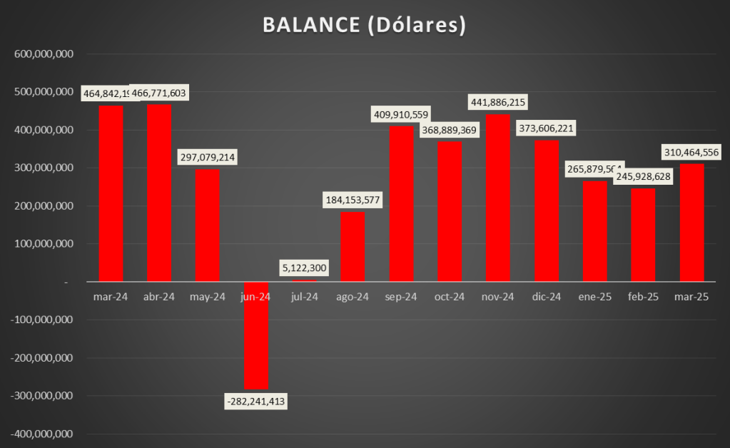 Las importaciones totales en marzo de 2025 fueron de 197,4 MMu$s y las exportaciones de 507,9 MMu$s, resultando un balance positivo de 310,5 MMu$s.