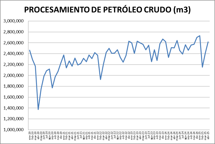 En abril de 2025, el procesamiento de petróleo crudo subió un 12,30% respecto del mes anterior. Respecto a abril de 2024, se procesó un 4,37% más.