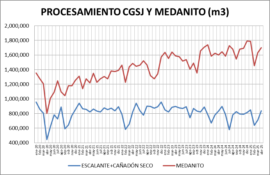 Escalante-Cañadón Seco: Se procesó, en abril de 2025, un 21,95% más que en marzo de 2025 y un 0,87% también superior a abril de 2024.