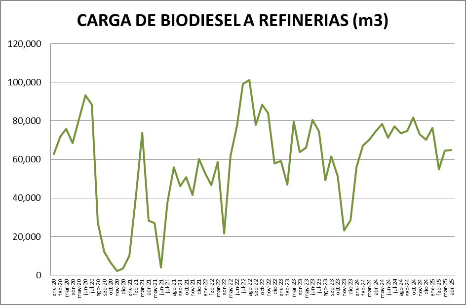 La carga de biodiesel en refinerías subió, en abril de 2025, un 0,53% respecto al mes anterior.