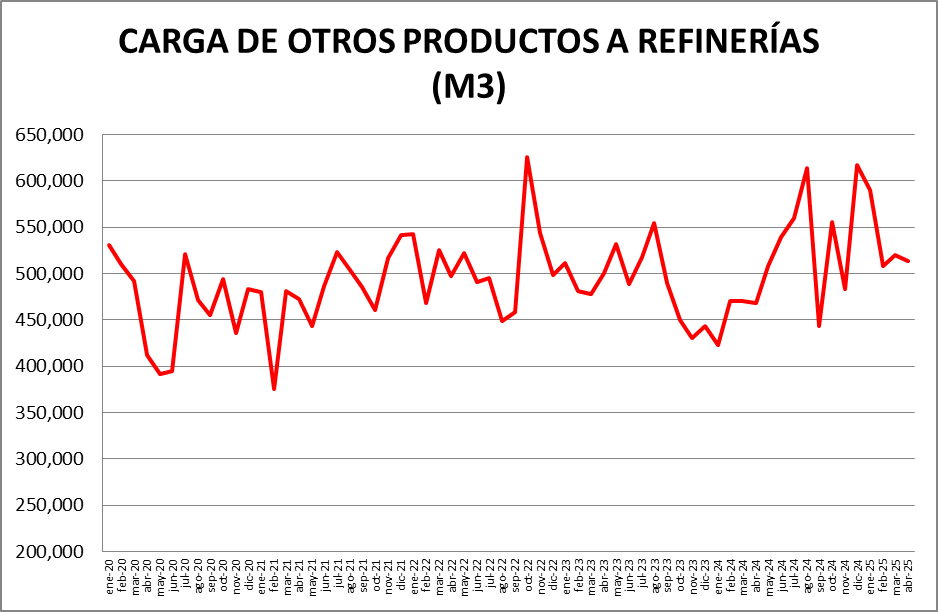 Dentro del rubro “Otras cargas” donde ” se encuentran: naftas sin terminar, mejoradores octánicos, cortes de gasoil, nafta virgen, cortes de kerosene, nafta reformada, destilado de vacío, etc., la evolución fue la siguiente: respecto a marzo de 2025: -1,67%; respecto a abril de 2024: +9,61%.