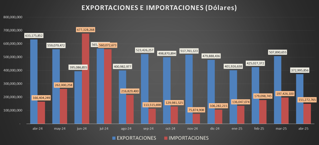 En abril de 2025 las importaciones bajaron, respecto de marzo de 2025, un 23,4%, mientras que las exportaciones también cayeron pero un 26,6%.
