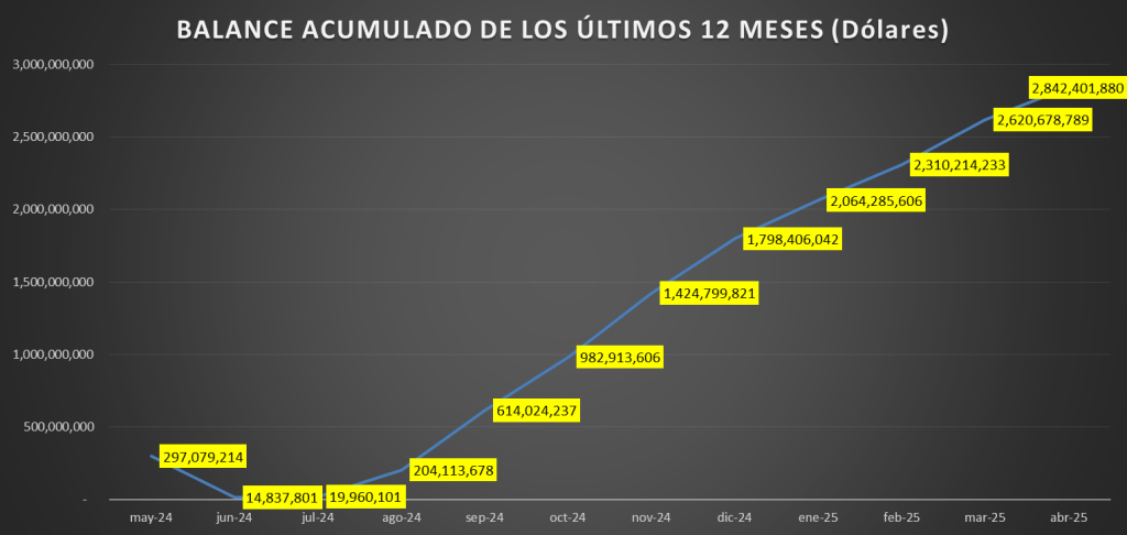 Las importaciones totales en abril de 2025 fueron de 151,3 MMu$s y las exportaciones de 373,0 MMu$s, resultando un balance positivo de 221,7 MMu$s.