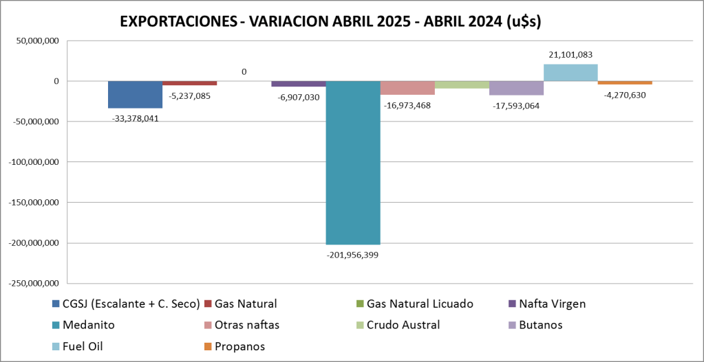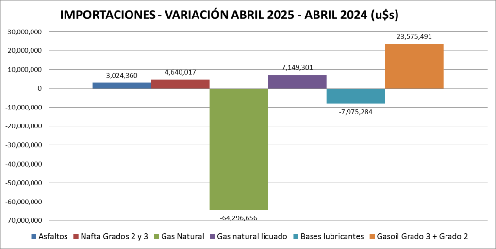 Con respecto al mismo mes del año anterior, las importaciones descendieron un 9,1% y las exportaciones un 41,1%. La principal causa del descenso de importaciones respecto a 2024 está basada en gas natural ya que dejó de comprarse el mismo a Bolivia (-64,3 MMu$s).