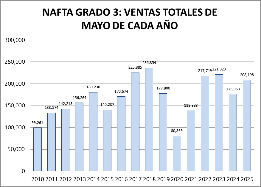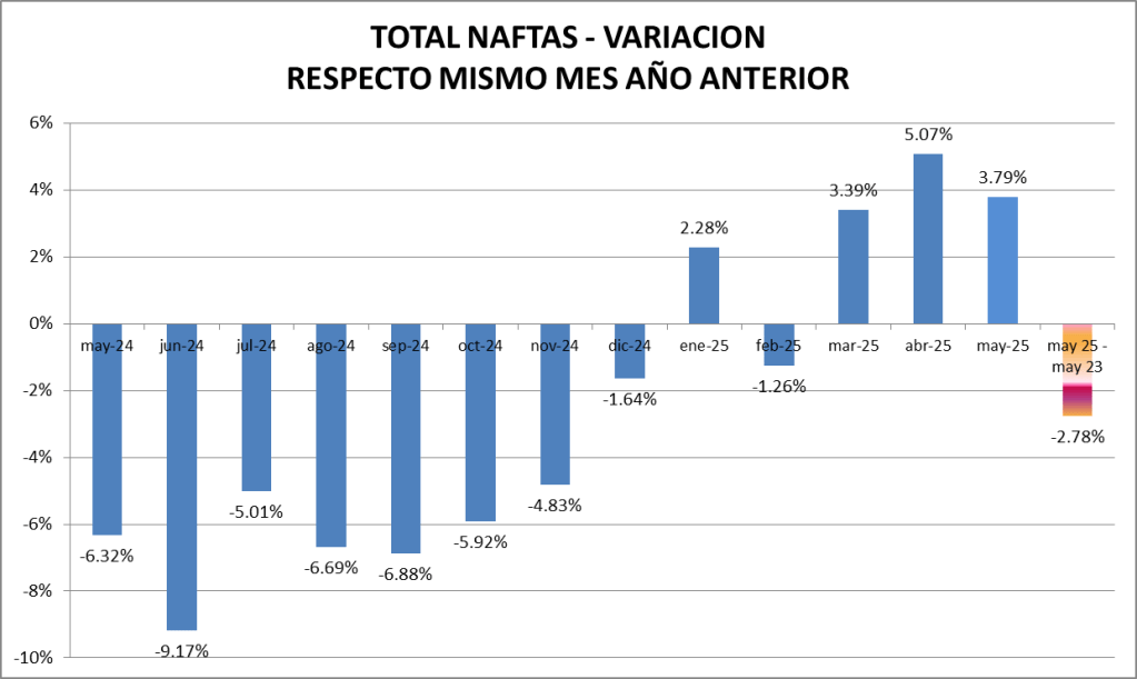 En mayo de 2025 las ventas totales de naftas subieron un 4,12 % respecto al mes anterior, y fueron un 3,79% mayor que un año atrás.