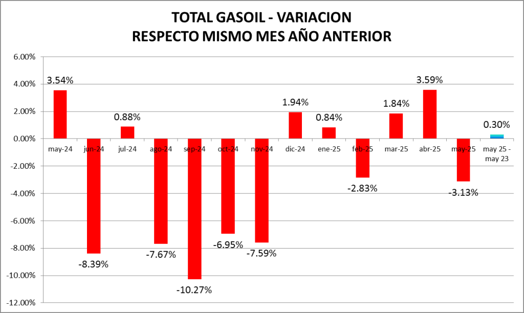 En este caso, las ventas de gasoil total fueron, en mayo de 2025, un 0,31% mayor a las de mayo de 2023. Se produce la dicotomía de que las ventas de gasoil total son mayores que las el 2023 y menores que las de 2024.