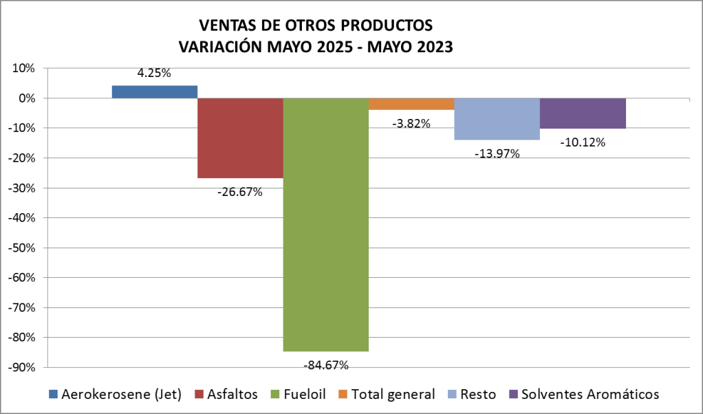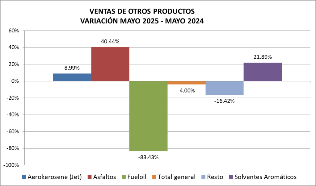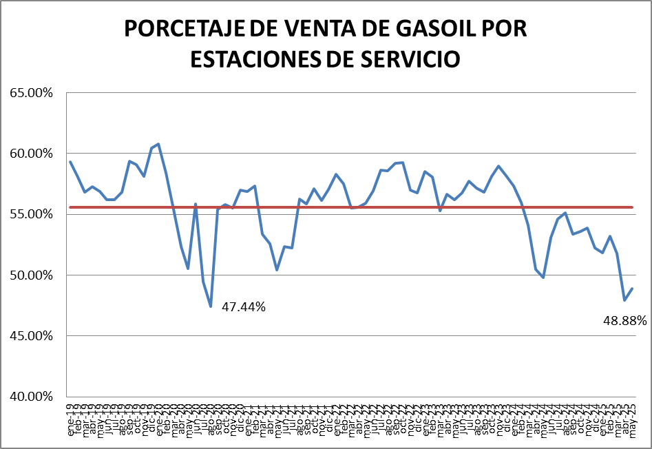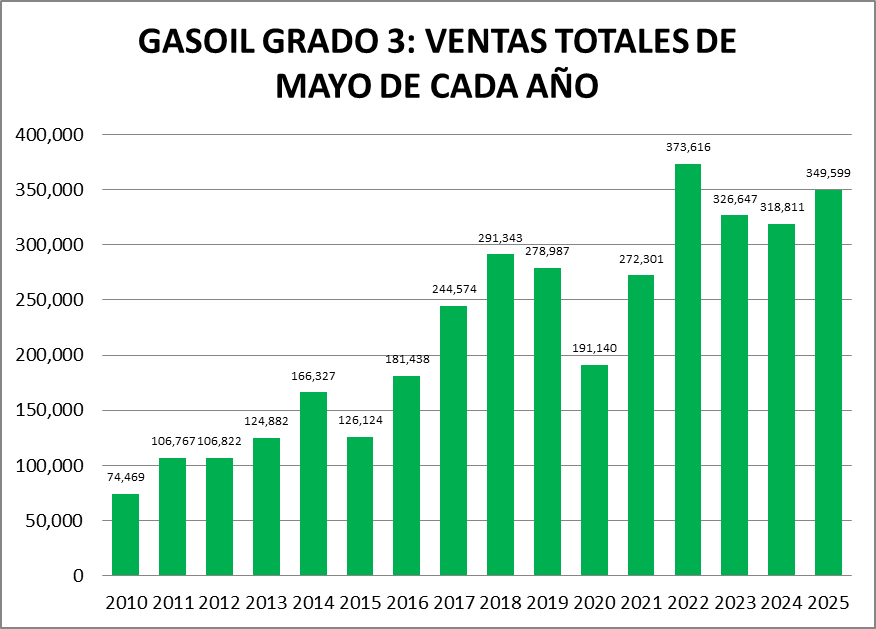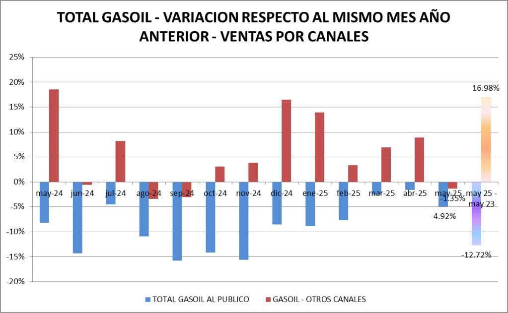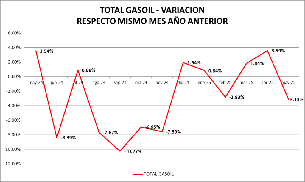 Las ventas totales de gasoil (todas las calidades, todos los canales) bajaron, en mayo de 2025., un 3,13% interanual. El volumen de gasoil expendido a través de los canales mayoristas bajó un 1,35% mientras que el descenso de lo vendido a través de estaciones de servicio fue de 4,92%.