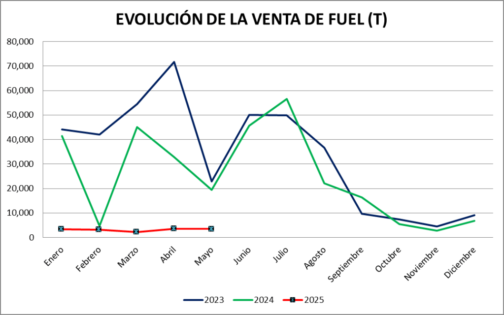 Las ventas de fuel oil registradas en mayo son de 3.496 toneladas, cifra muy por debajo a la vendida en el año 2024.