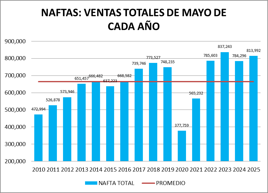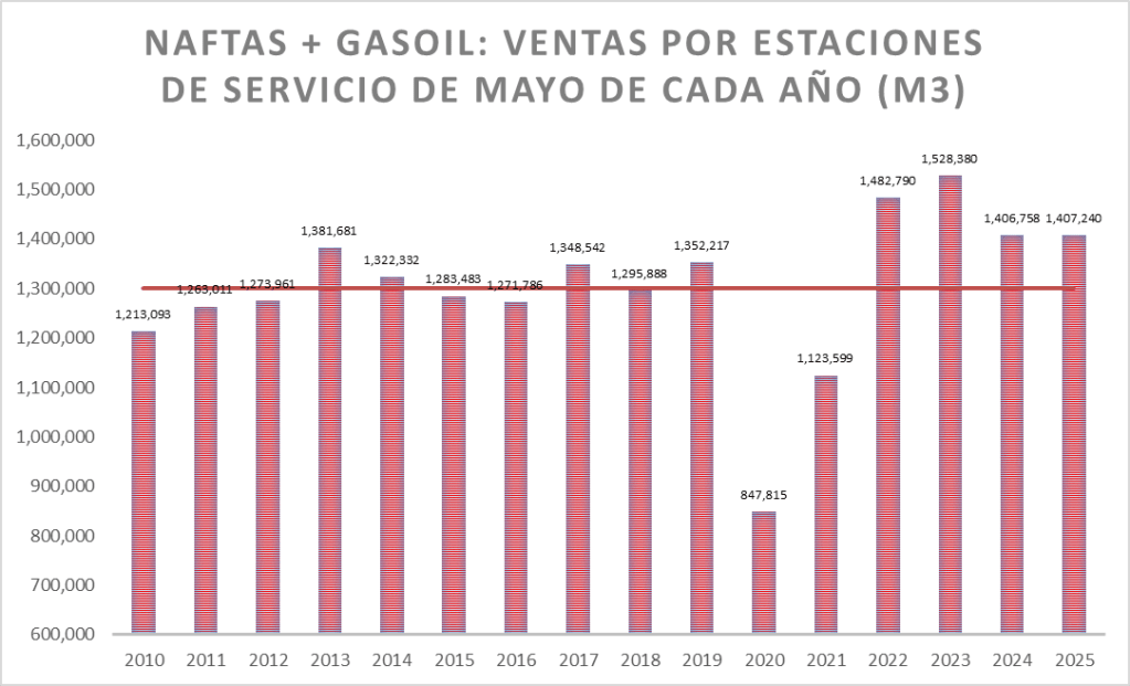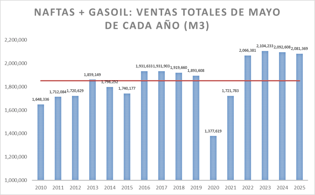 En el caso de las naftas, en mayo de 2025, la venta no fue la mejor de la serie.
