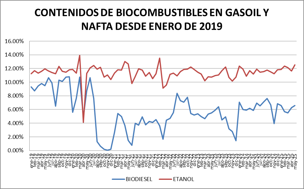 El contenido de bioetanol en naftas fue del 12,54% en mayo de 2025, en el entorno normal de funcionamiento del sistema.