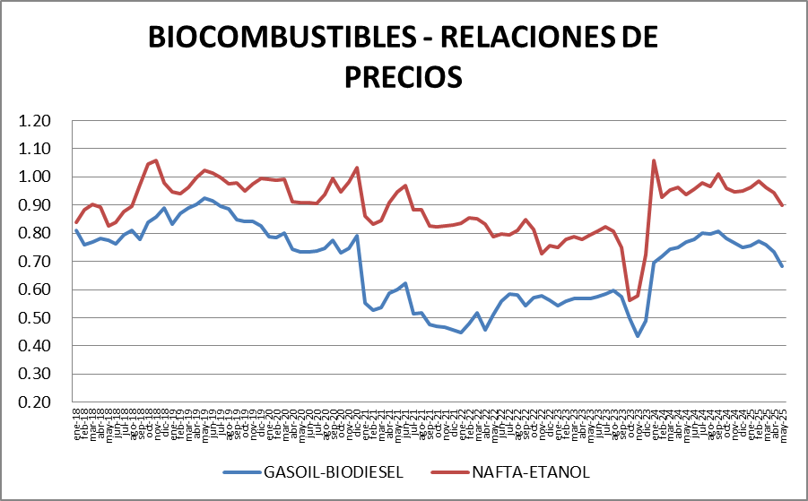 El aumento en pesos entre mayo y abril del biodiesel (5,00%) superó el crecimiento del tipo de cambio en el mismo período (+2,41%). Los dos etanoles aumentaron 2,00% en pesos y perdieron valor en dólares.