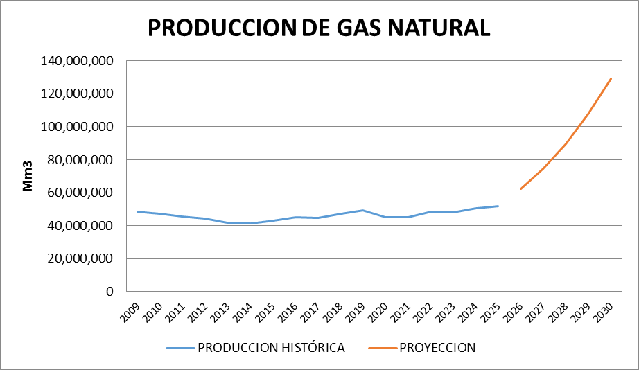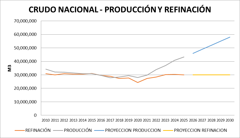 La proyección del aumento de producción de crudo es lineal entre 2025 y 2030 hasta llegar a 58 millones de metros cúbicos (28 millones exportables).