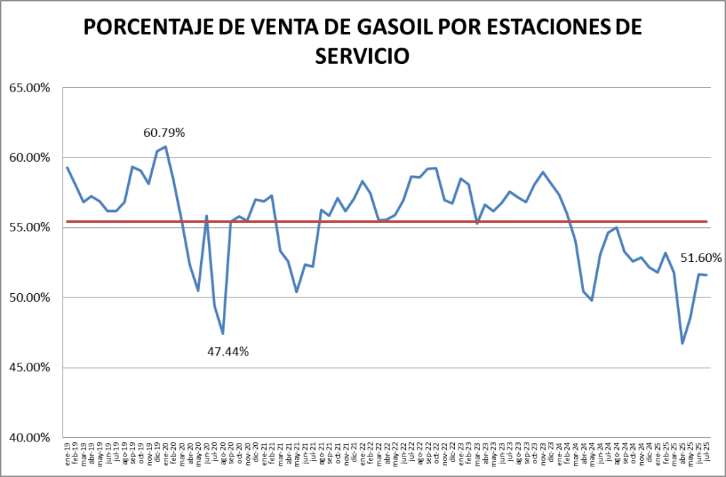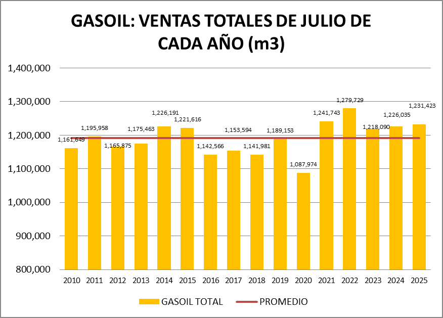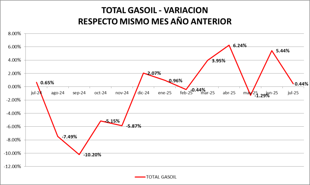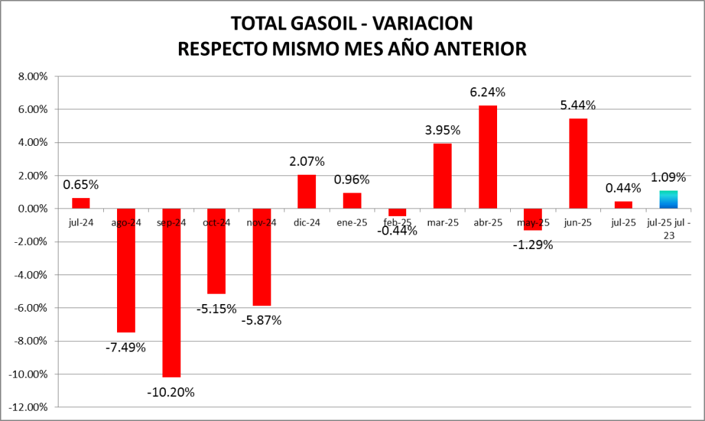En este caso, las ventas de gasoil total fueron, en julio de 2025, un 1,09% mayor a las de julio de 2023.