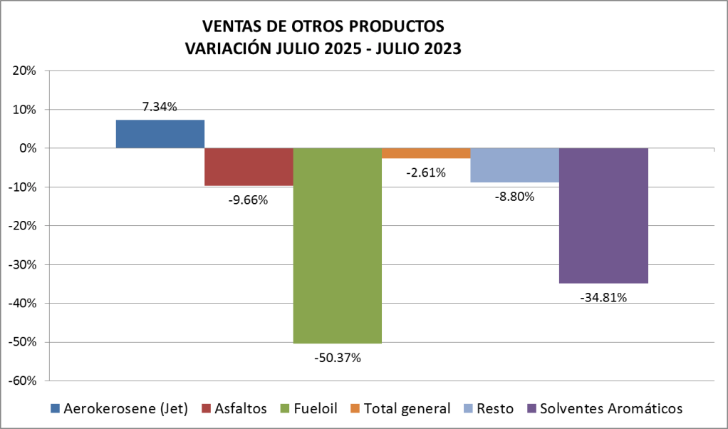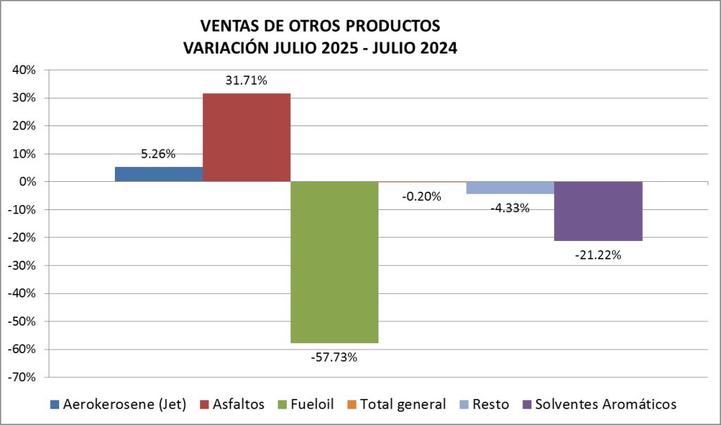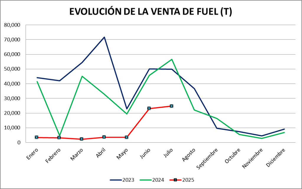 Las ventas de fuel oil registradas en julio son de 24.757 toneladas, cifra por debajo a la vendida en el año 2024, pero superior a los meses anteriores por su utilización para generación en los meses fríos.