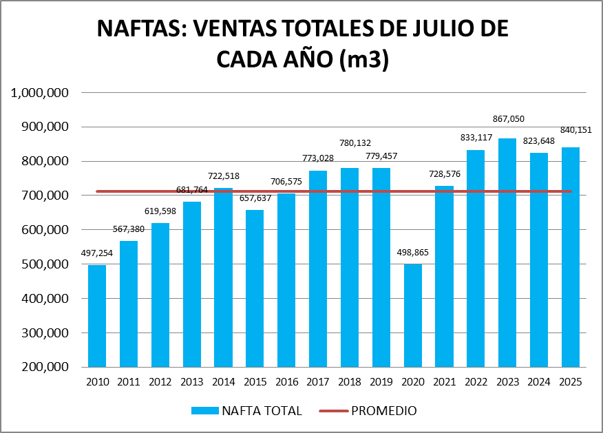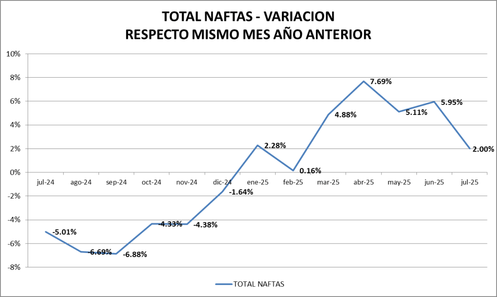 En julio de 2025 las ventas totales de naftas subieron un 6,22 % respecto al mes anterior, y fueron un 2,00% mayor que un año atrás.