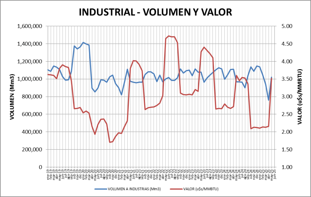 El valor del gas natural con dirección al sector industrial subió un 62,96% en mayo de 2025 respecto a abril de 2025.