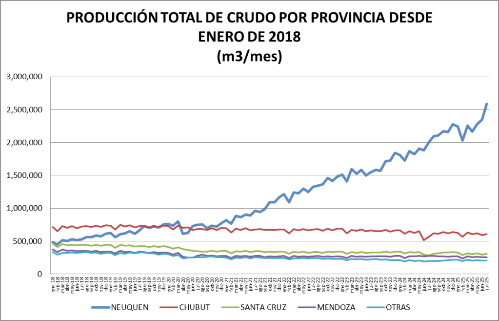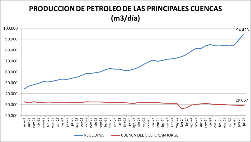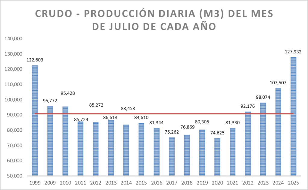 La producción diaria de petróleo crudo de julio de 2025 fue la mayor de esos mismos meses desde el año 1999. Se acerca a la mayor histórica que se producción en el año 1998 y que fue cercana a los 137.000 metros cúbicos diarios.