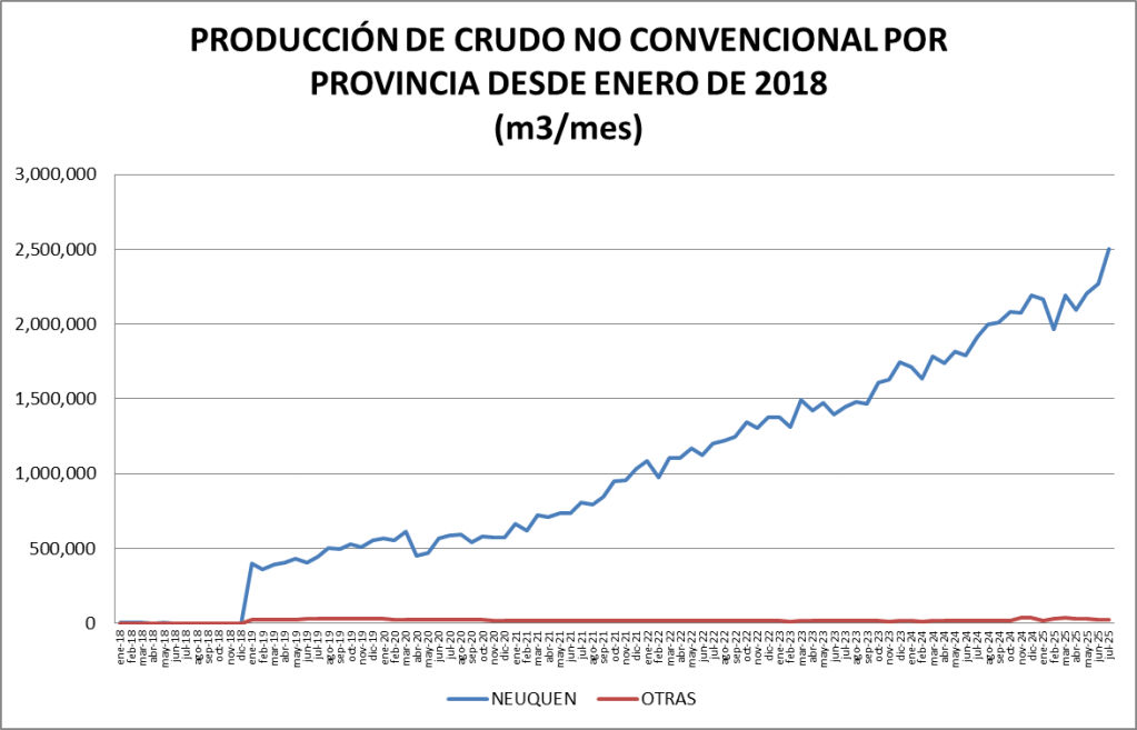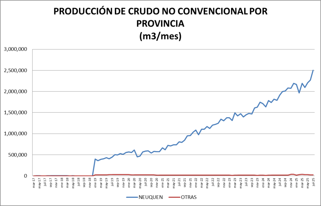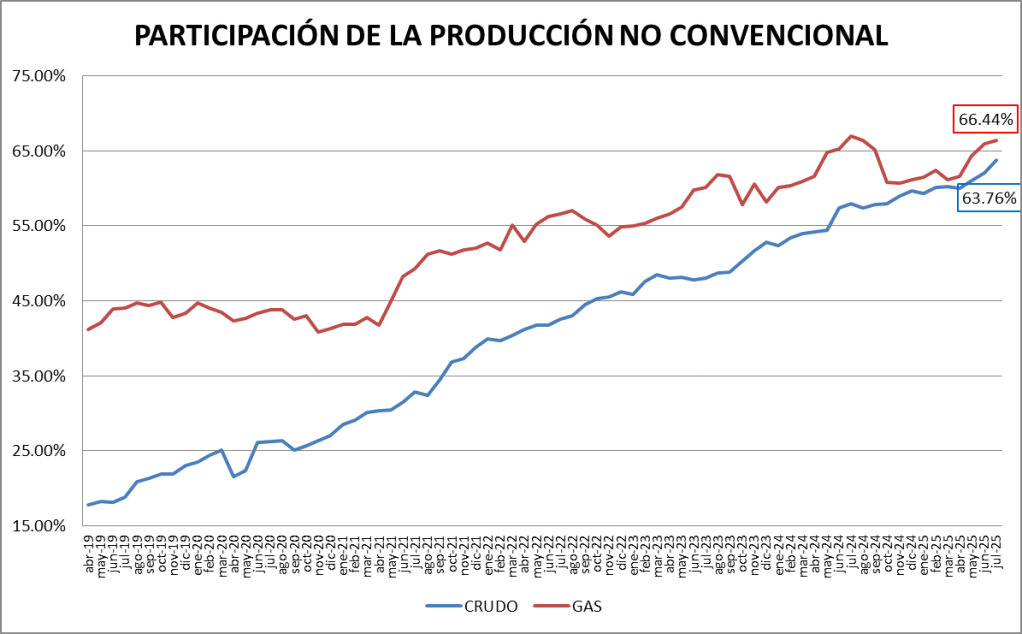 La participación del crudo no convencional en el total de la producción nacional fue, en julio de 2025, del 63,76%, y se constituye en un nuevo récord.