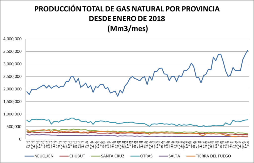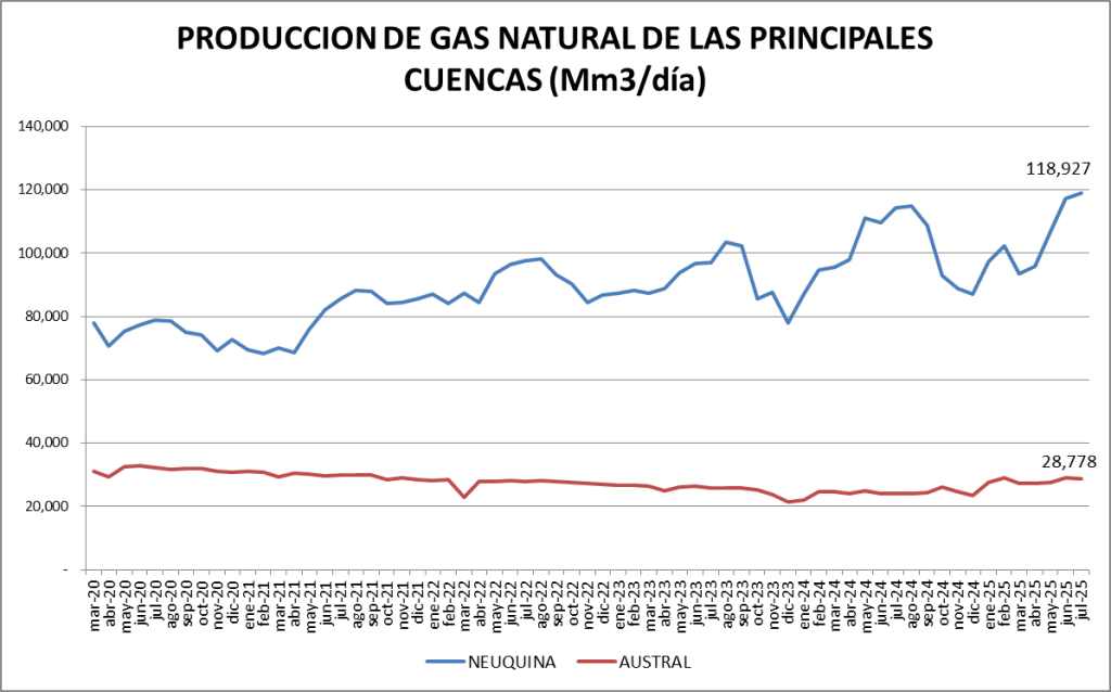 La producción de gas natural de julio de 2025 es la mayor de la serie.