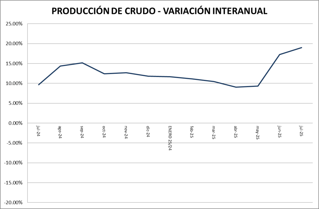 En el mes de julio de 2025, en petróleo crudo, se muestra un crecimiento interanual no consistente con lo acontecido los meses anteriores.