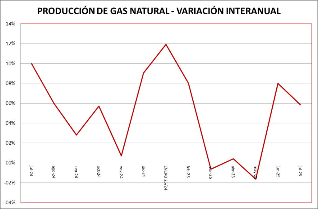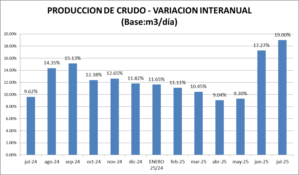 El crecimiento respecto a julio de 2024 fue de 19,00%. Este aumento, superior a los que venían registrándose, se debe a que julio de 2024 fue un mes de relativa baja producción. El aumento que no se corresponde a los históricos se registra en la cuenca del Golfo San Jorge (+7,7%). La reducción de producción se produjo por un temporal de nieve en junio y se comenzó a recuperar en julio.