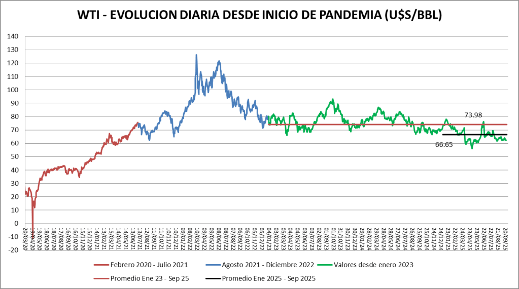 El promedio desde enero de 2023 a la actualidad es de 73,98 u$s/bbl, pero el promedio del año 2025 baja a 66,67 u$s/bbl.