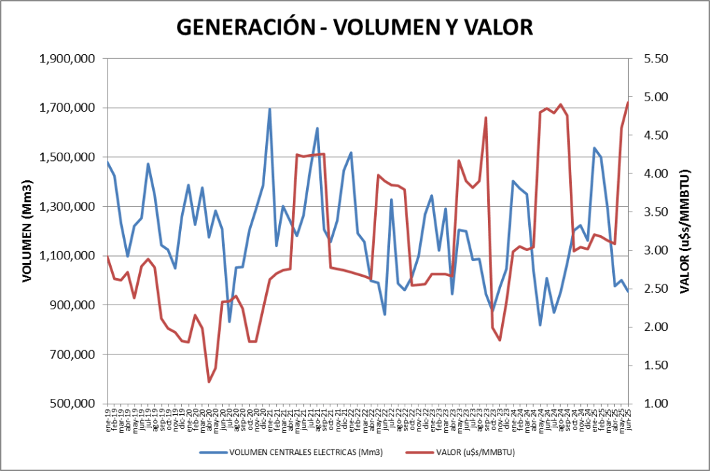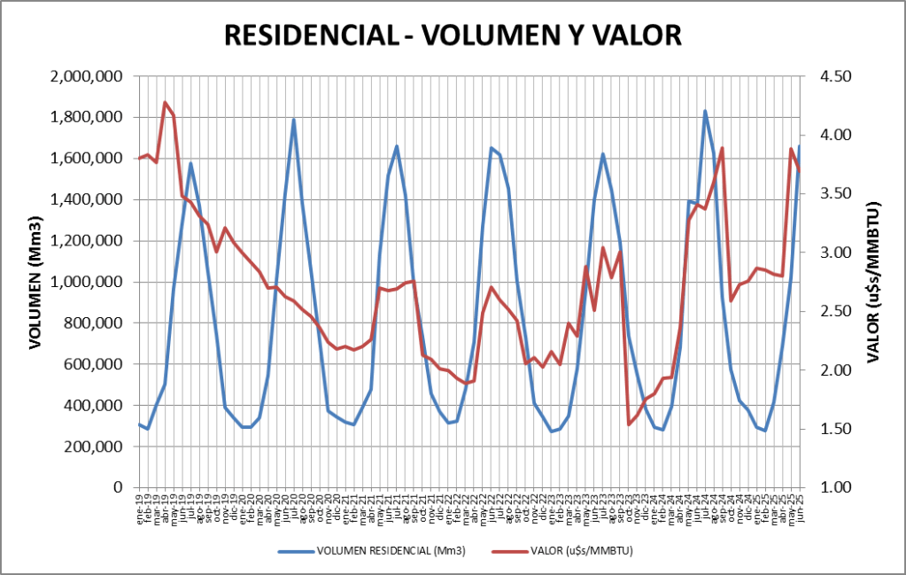 En cuanto al volumen, se consumieron 31,86 MMm3/día en promedio 1,46% menos que el mes anterior y 5,24% inferior a junio de 2024.