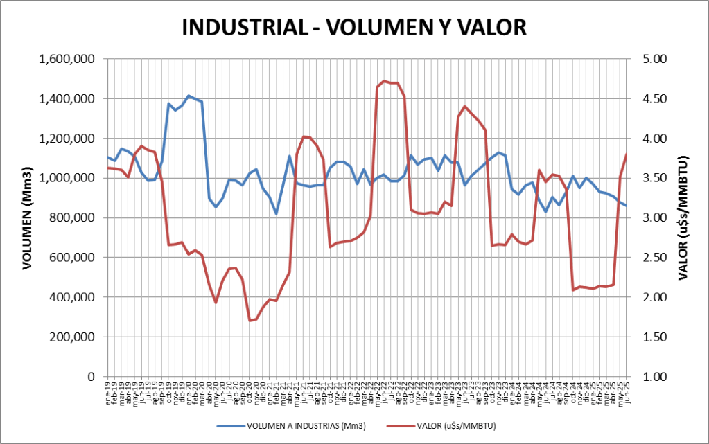 El valor del gas natural con dirección al sector industrial subió un 7,95% en junio de 2025 respecto a mayo de 2025.