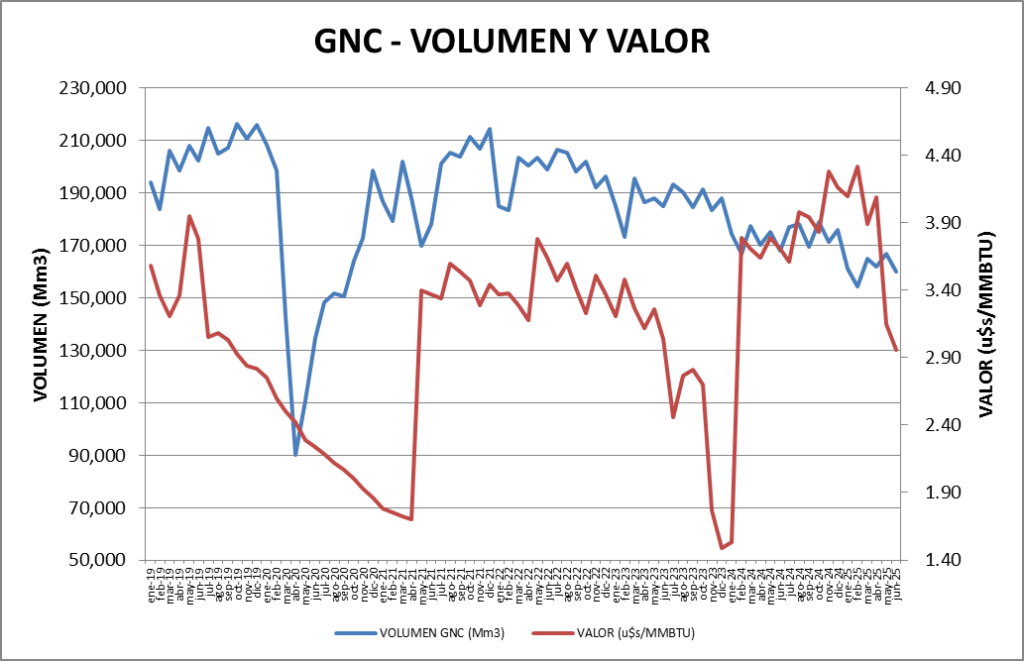 Se vendieron, en junio de 2025, 5,34 MMm3/día de Gas Natural Comprimido, valor un 0,77% por debajo del mes anterior y un 4,74% también menor al de junio de 2024.