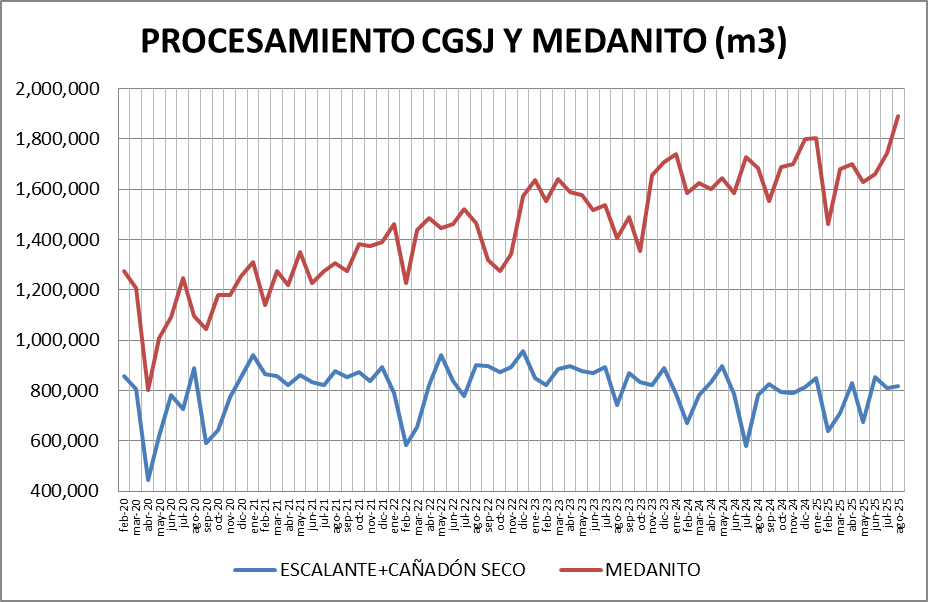 Escalante-Cañadón Seco: Se procesó, en agosto de 2025, un 0,97% más que en julio de 2025 y un 4,36% por encima de agosto de 2024.