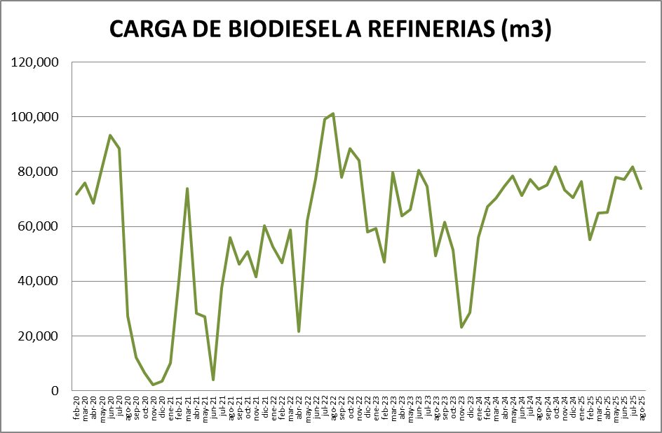 La carga de biodiesel en refinerías bajó, en agosto de 2025, un 9,79% respecto al mes anterior.