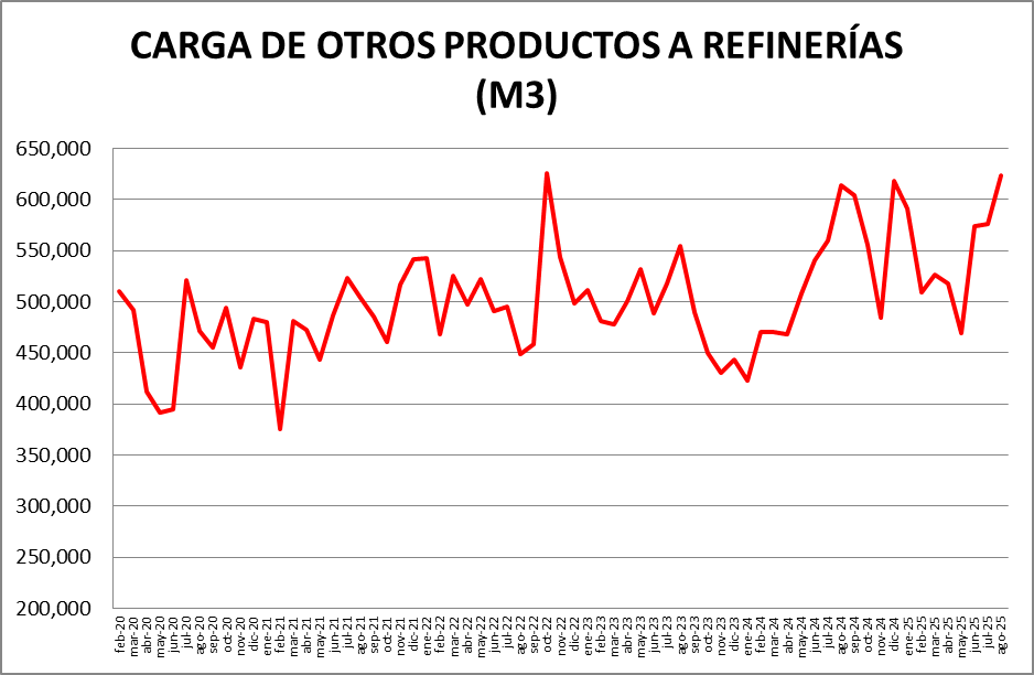 Dentro del rubro “Otras cargas” donde ” se encuentran: naftas sin terminar, mejoradores octánicos, cortes de gasoil, nafta virgen, cortes de kerosene, nafta reformada, destilado de vacío, etc., la evolución fue la siguiente: respecto a julio de 2025: +8,29%; respecto a agosto de 2024: +1,57%.