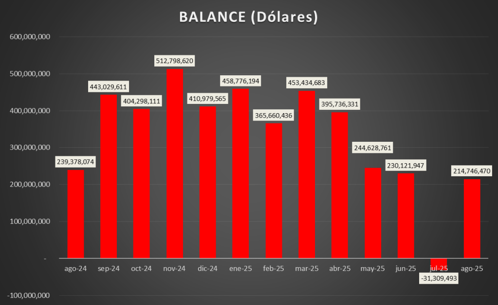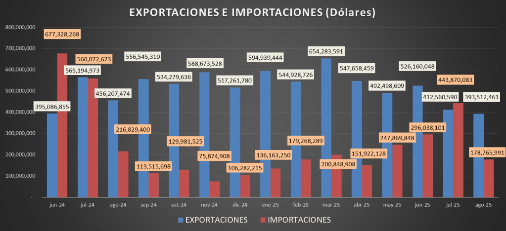 En agosto de 2025 las importaciones bajaron, respecto de julio de 2025, un 59,7%, mientras que las exportaciones también cayeron pero un 4,62%.