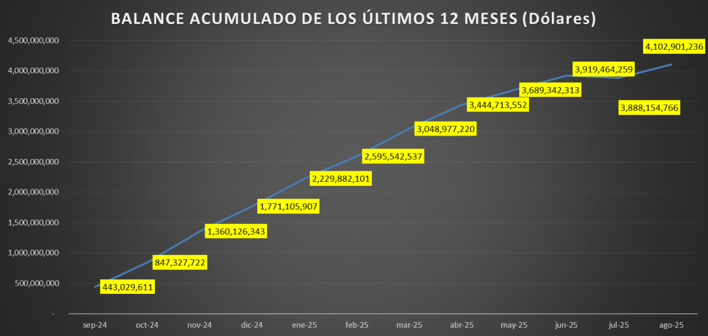 Las importaciones totales en agosto de 2025 fueron de 178,8 MMu$s y las exportaciones de 393,5 MMu$s, resultando un balance positivo de 214,7 MMu$s.