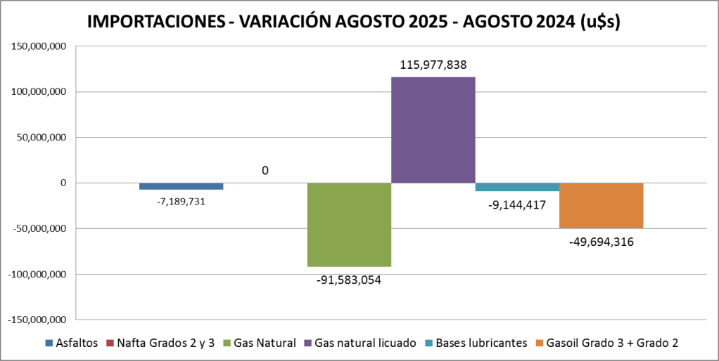 La principal causa del descenso de importaciones respecto a 2024 está basada en gas natural ya que dejó de comprarse el mismo a Bolivia (-91,6 MMu$s) y gasoil (-49,7 MMu$s).